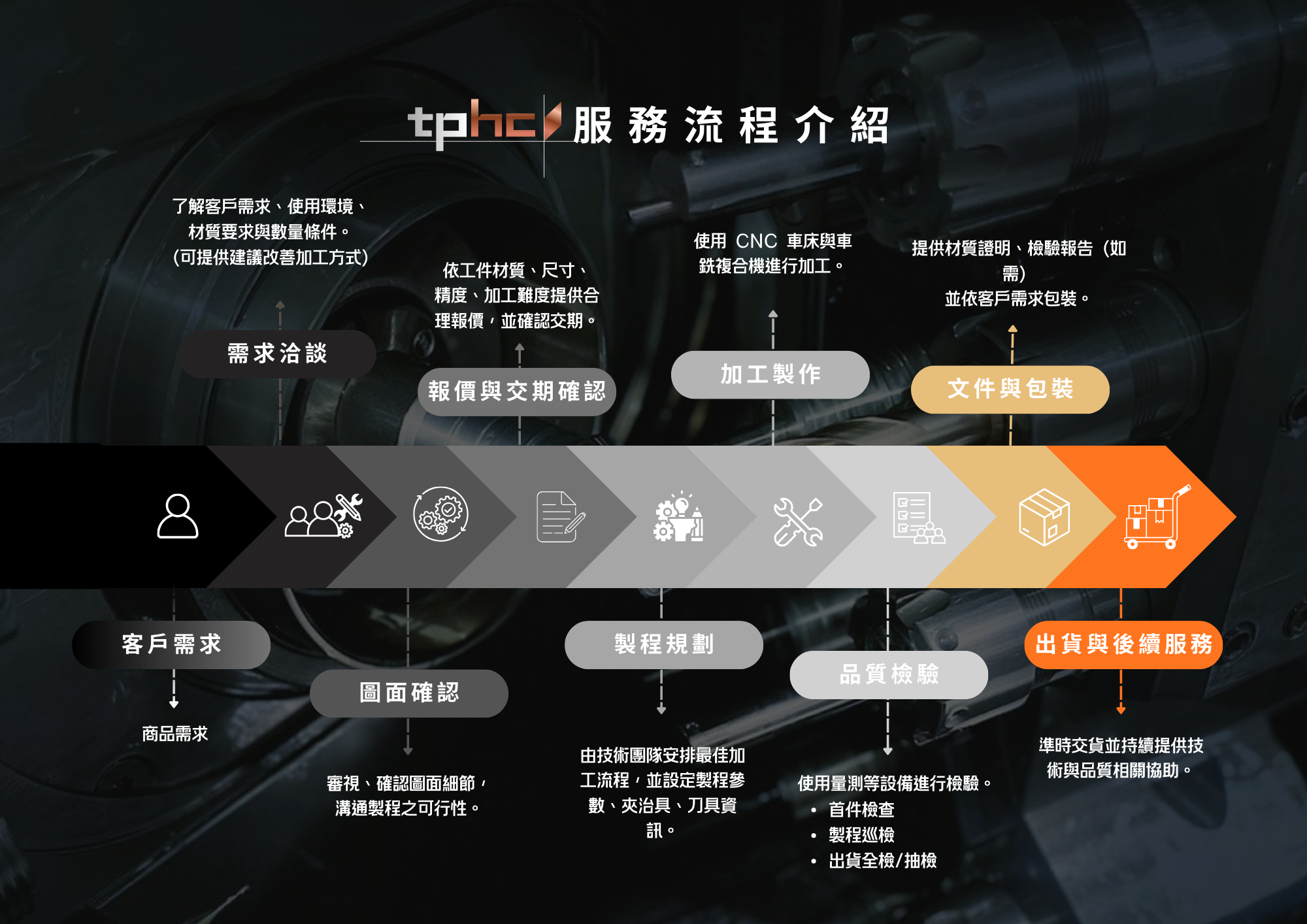 透過技術、設備與品質管理的整合,我們為客戶提供穩定、高精度且可長期信賴的加工品質。